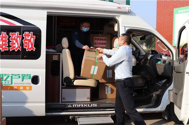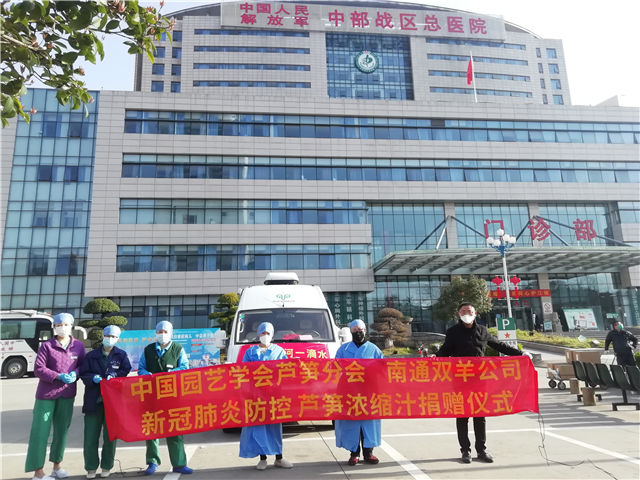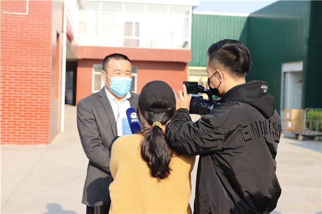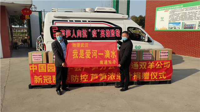 在简短的捐赠仪式上,基地负责人、双羊公司总经理张晓虎接受了如东人民广播电台和如东电视台记者的采访。张总经理表示,病毒无情人有情,此次捐赠、驰援武汉,是南通双羊芦笋人尽自己的绵薄之力,向奋战在一线的抗疫英雄表示敬意。
