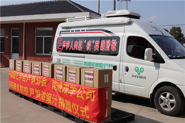 3月14日下午,如东曹埠社教中心芦笋基地举办驰援武汉捐赠仪式,首批捐赠的36箱芦笋香菇浓缩液,价值近30万元,该基地即将装车发往武汉。