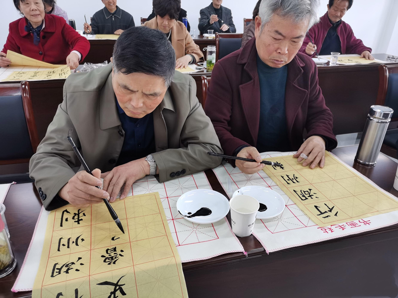 讲完书法基本知识后,惠老师让大家对照字帖,从笔画开始联习,再到简单的字和短句。他边巡视边点评和指导,最后还现场书写了一幅书法作品,鼓励老人们克服畏难情绪,练好基本功,学习前人,持之以恒,修身养性,力争人人书法有进步。