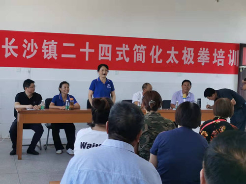 如东县老年体协秘书长李娟娟参加活动并致辞;如东县长沙镇社区教育中心教导主任唐卫东主持培训活动;区镇老年体协负责人赵洪清给参加活动的学员们简要介绍了二十四式简化太极拳的历史演变及在如东县发展的情况;特聘教练张桂兰给学员们作了现场演示并给学员们进行了招式分解讲解。