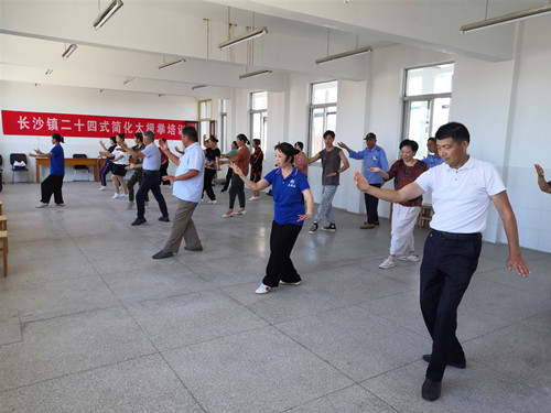 为推广简化太极拳锻炼,进一步促进如东县长沙镇人民群众开展全民学习、全民健身活动的开展, 9月30日下午,南通市如东县长沙镇社教中心、区镇教育工会联合区镇老年体协组织开展了二十四式简化太极拳培训。来自机关、教育和各社区的40多名社区居民在社教中心四楼健身房参加培训活动。